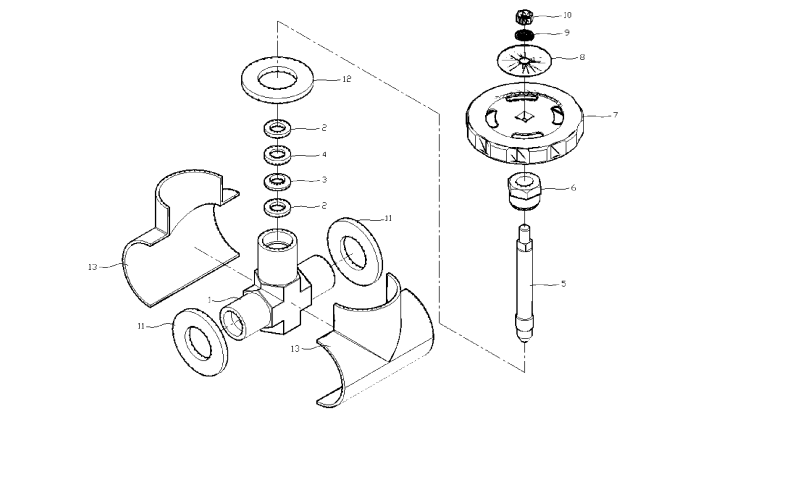 如圖2所示,本發(fā)明產(chǎn)品包括閥體1、主軸墊圈2、主軸密封件3和4、主軸5、主軸帽6、手柄7、真空絕緣殼體結(jié)構(gòu),由彈簧8、彈簧墊圈9和螺母10以及用于焊接的襯套11組成的基本阻隔流體結(jié)構(gòu), 用于真空釬焊的襯套 12 和真空外殼 13 輸了。主軸墊圈2、主軸密封件3和4、主軸5和主軸蓋6與閥體1組裝在一起,作為關(guān)閉流體的基本功能。)、彈簧墊圈(9)和螺母(10)組裝在一起,起到關(guān)閉流體的作用。將焊接襯套11和真空殼13通過一般氬焊等相互粘接,以確保一定的真空空間并支撐真空殼13,真空殼13和真空殼13在10-5托或更小的真空狀態(tài)下通過真空釬焊粘合,以保持閥體1和真空殼13之間的空間在真空狀態(tài)。真空箱形成的真空空間起到阻擋輻射熱和從外部傳遞的對(duì)流熱的作用。